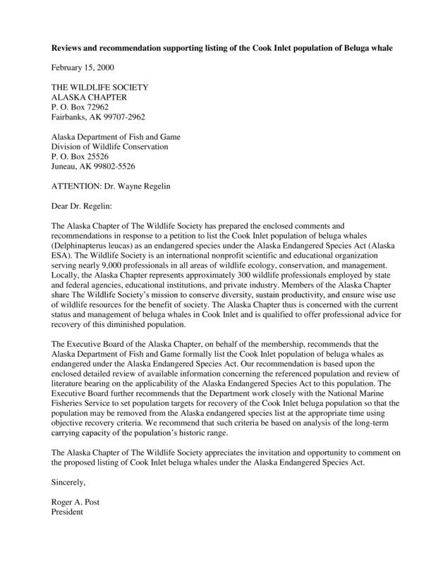 - A detailed review and recommendation by the Alaska Chapter of The Wildlife Society supporting the listing of the Cook Inlet population of beluga whales as endangered under the Alaska Endangered Species Act, citing genetic isolation, population decline, and threats from overharvesting and environmental factors.